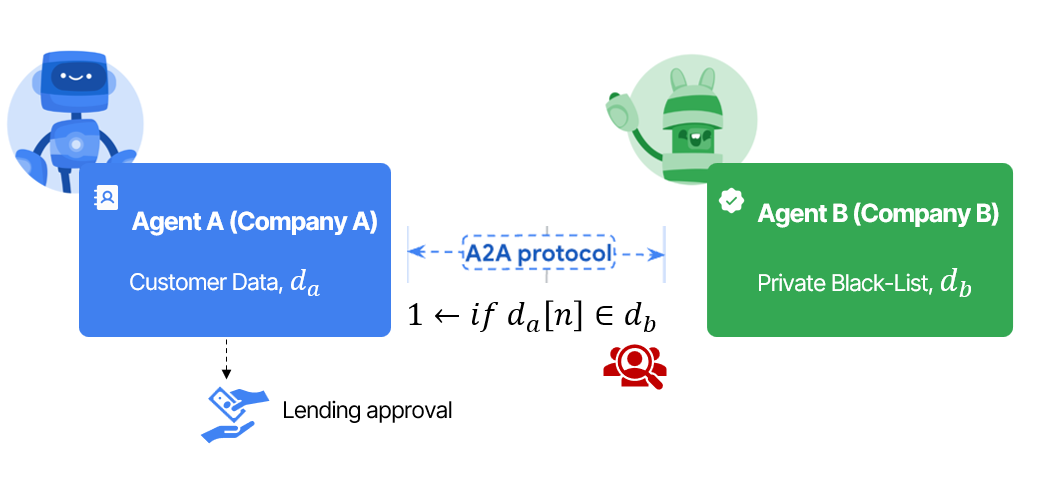 Imagine Company A's agent A has a private list and company B's Agent has access to much richer and bigger, private list. Using this function, Agent A will be able to collaborate on insights without exposing set members and raw data sets, do private queries without revealing about her intent. A2A-CCVM enables two powerful functions under 2-party SMPC: private-set intersection (PSI) and private information retrieval (PIR) for such cases.